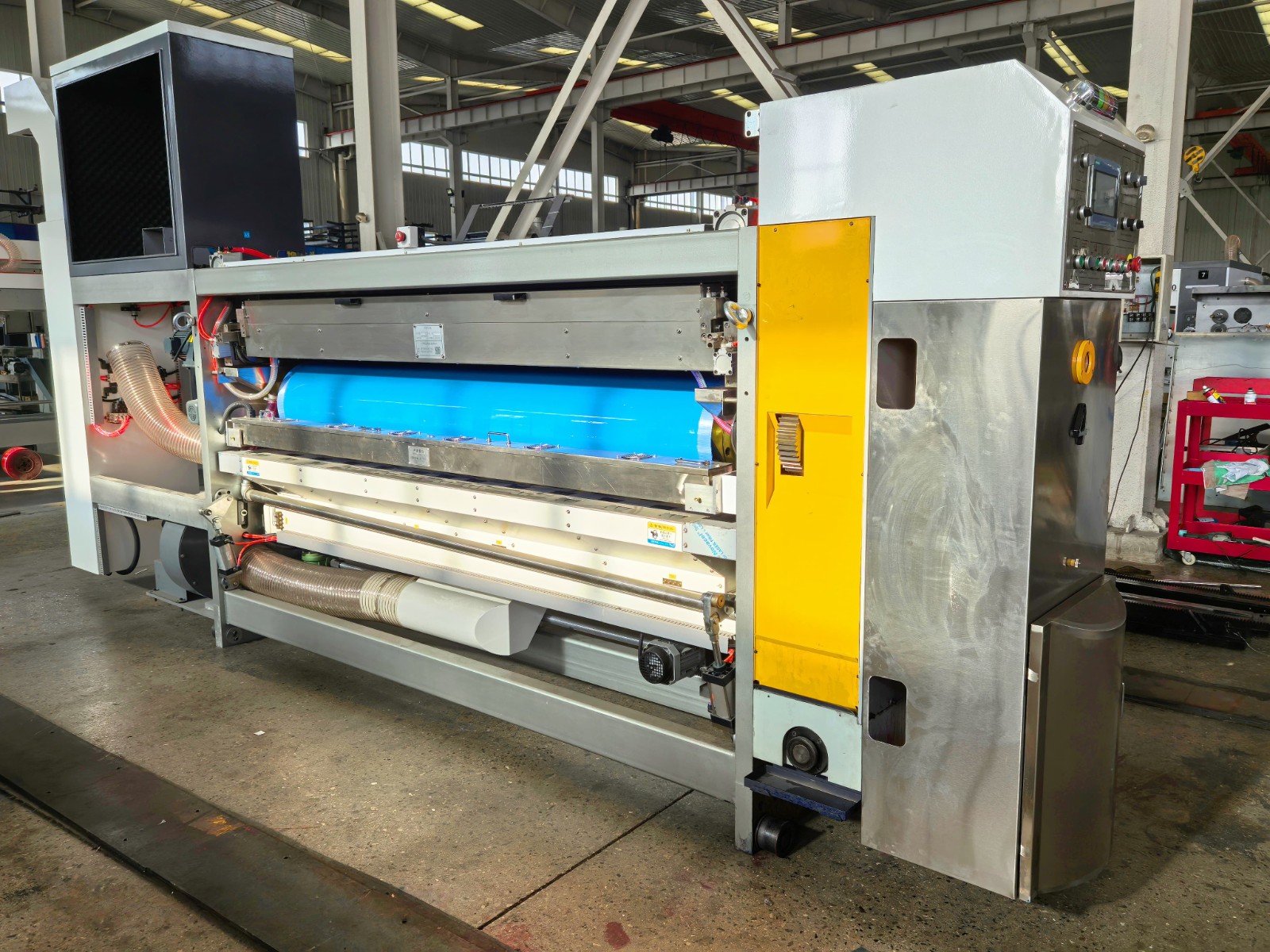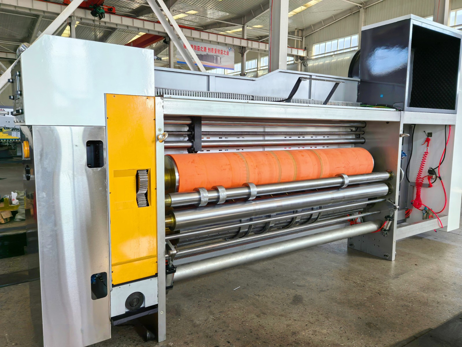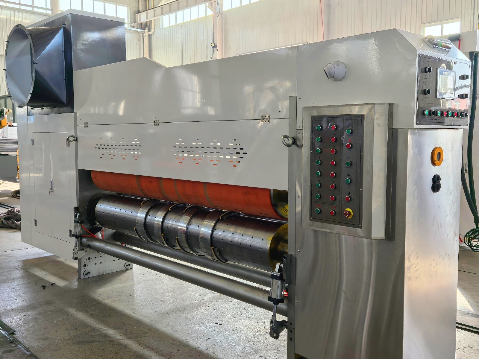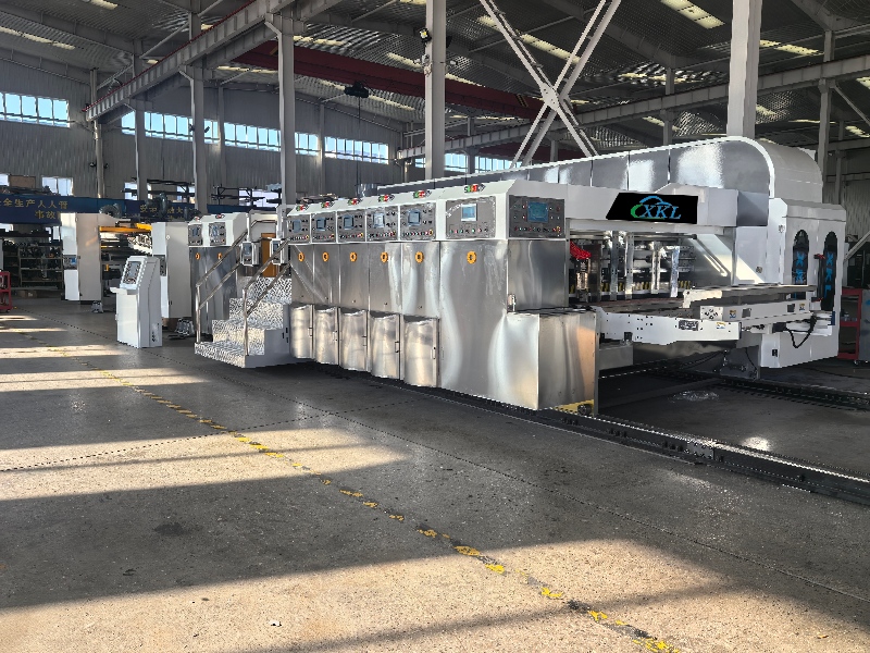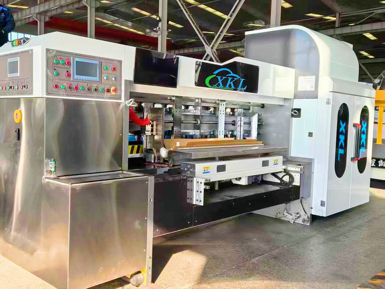 This machine aimed at solving the existing carton printing machinery poor automation, low stability, poor reliability, unsightly appearance, short life and other problems. It adopts high speed direct printing method, which integrates printing, drying, varnish, slotting, die-cutting, gluing box, folding and carton forming. It can complete the production process from corrugated board to finished packaging carton at one time. It equipped with automatic feeding unit, automatic computer control, digital display, using precision servo motor and electronic modules to adjust and monitor the entire production process.